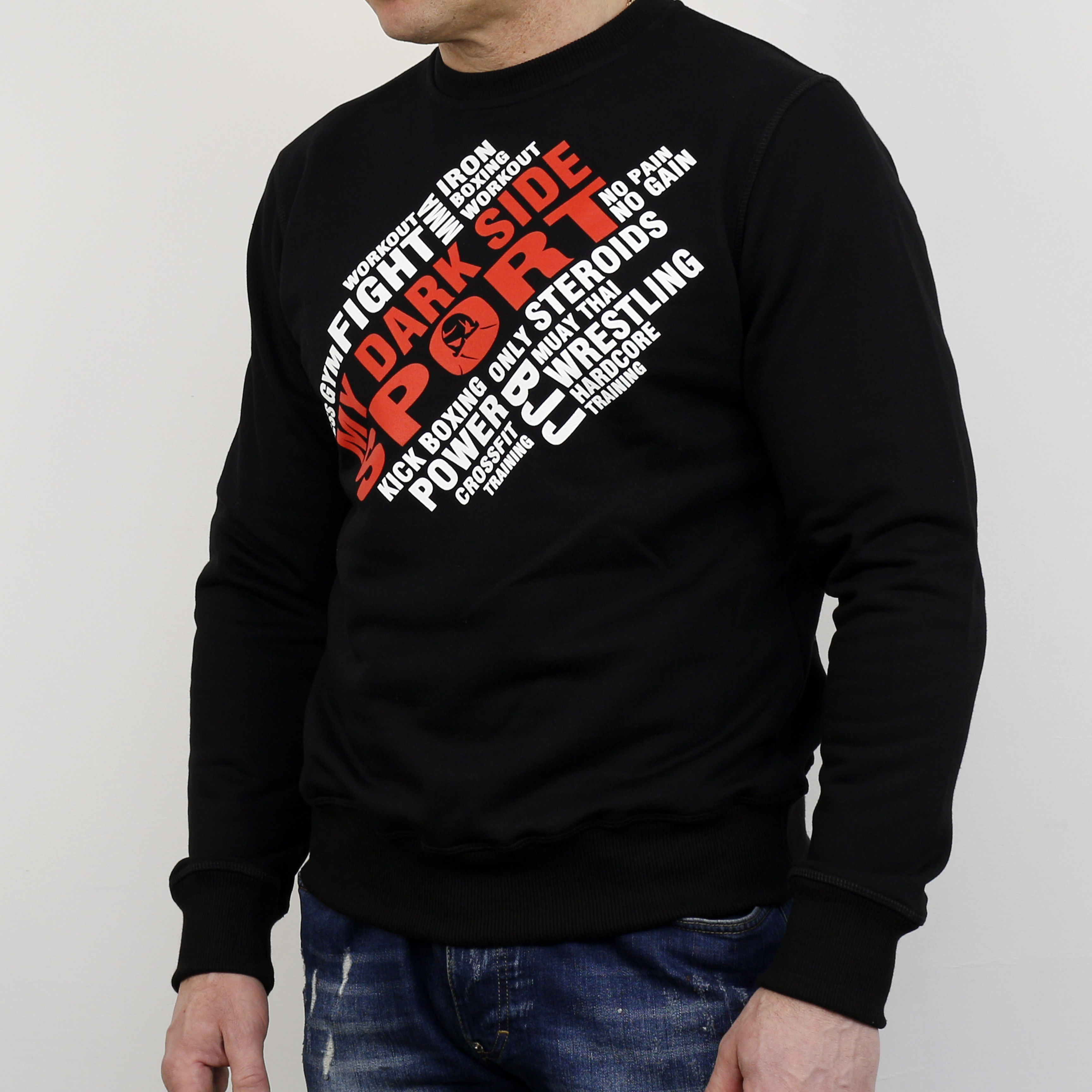 Hardcore training sweatshirt in black color in My Dark Side style. Thick cotton with the addition of polyester prevents the sweatshirt from stretching in the wash and keeps its shape for years. White and red very detailed screen-printing on entire back and in front.