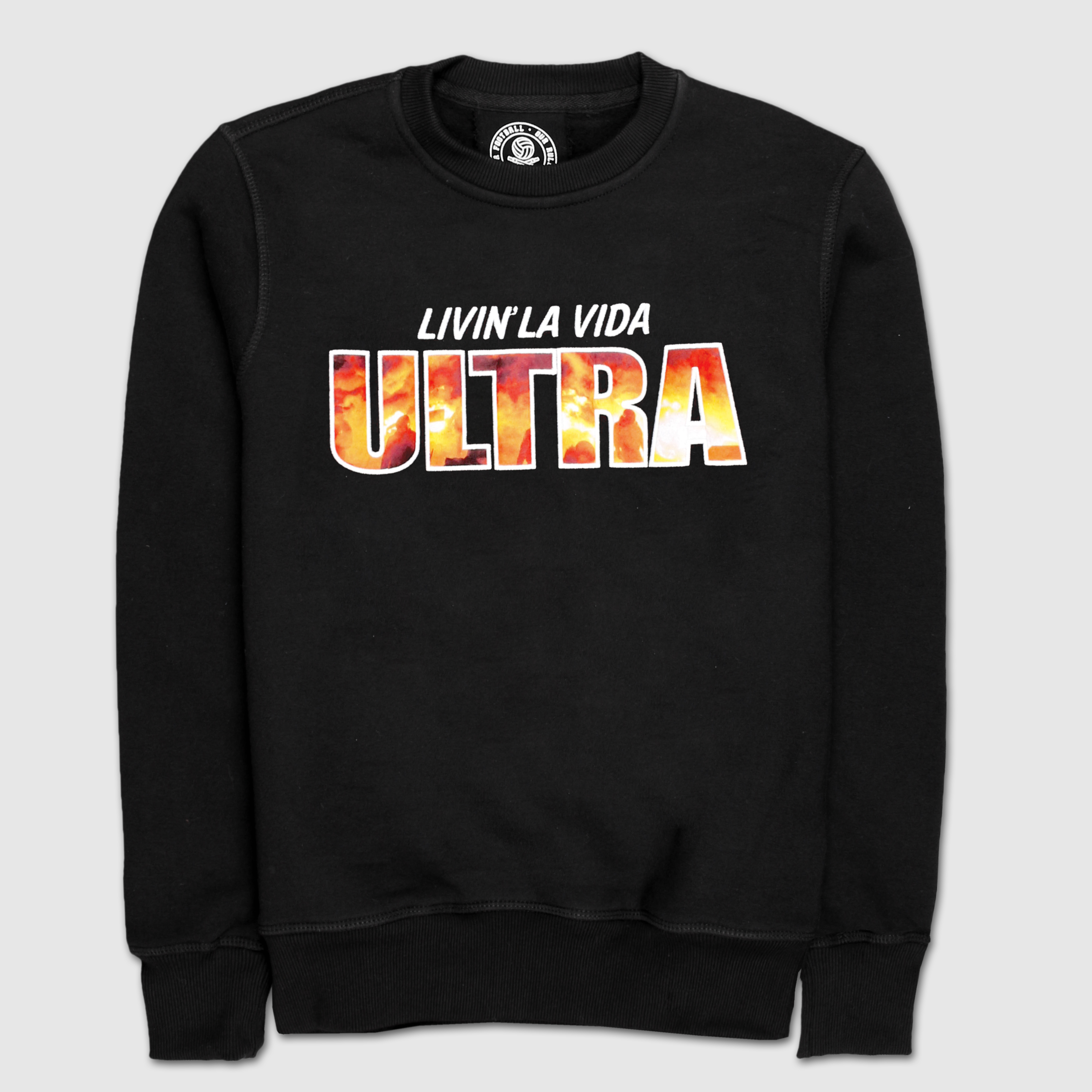 Livin la vida ultra sweatshirt in black color in USW Ultras style. Thick cotton with the addition of polyester prevents the sweatshirt from stretching in the wash and keeps its shape for years.
