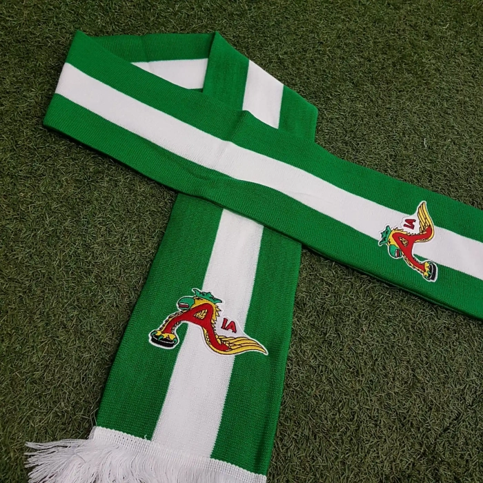 If you'd like to embellish your scarves with a club emblem or logo, we can embroider the ends. Typically, striped scarves have embroidery on one side only (usually on both ends, but we can also do it on one), 3-4 cm from the fringe or in the center of the side stripes. If your design is very detailed, we can create woven patches, full sublimation printing, or a combination of both. The maximum embroidery width on a scarf is 14 cm.