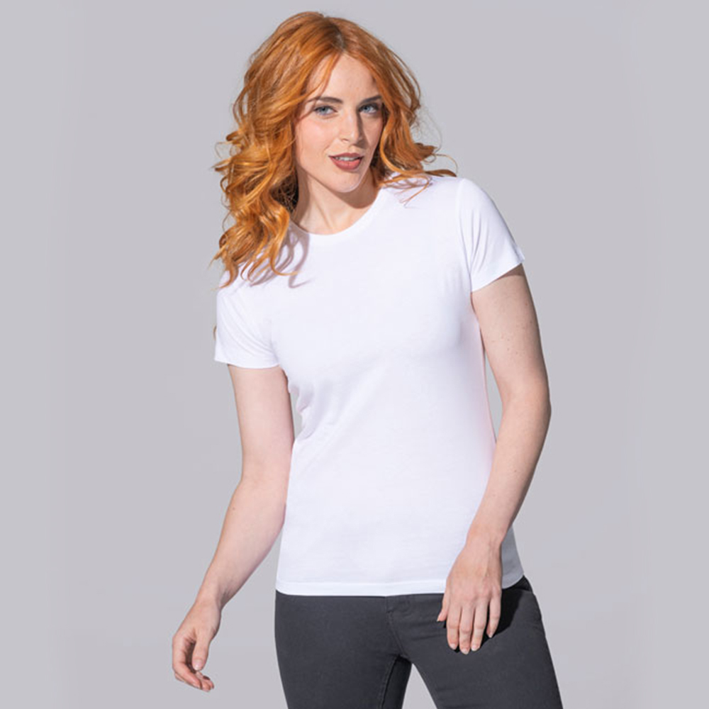 The T-shirt has a slightly fitted cut, which subtly emphasizes the female figure while maintaining freedom of movement. Double seams on the shoulders increase its durability.