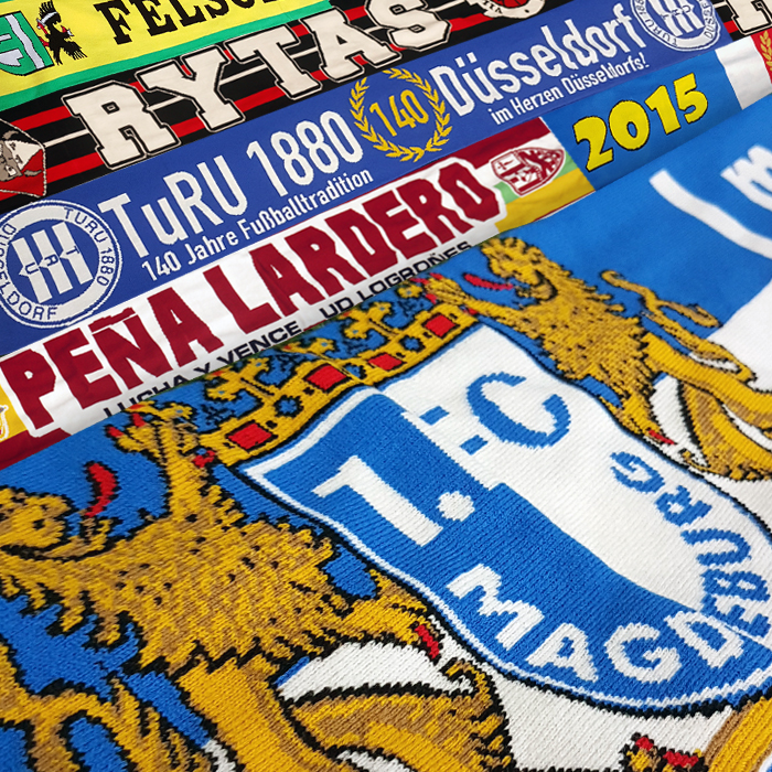 These scarves are made of acrylic yarn. There can be up to 7 colors in each scarf. Both sides can be different. Scarf size is 19cm in width and 145-155 cm in length. We adjust it depending on your design to avoid stretching important elements like emblems, logos